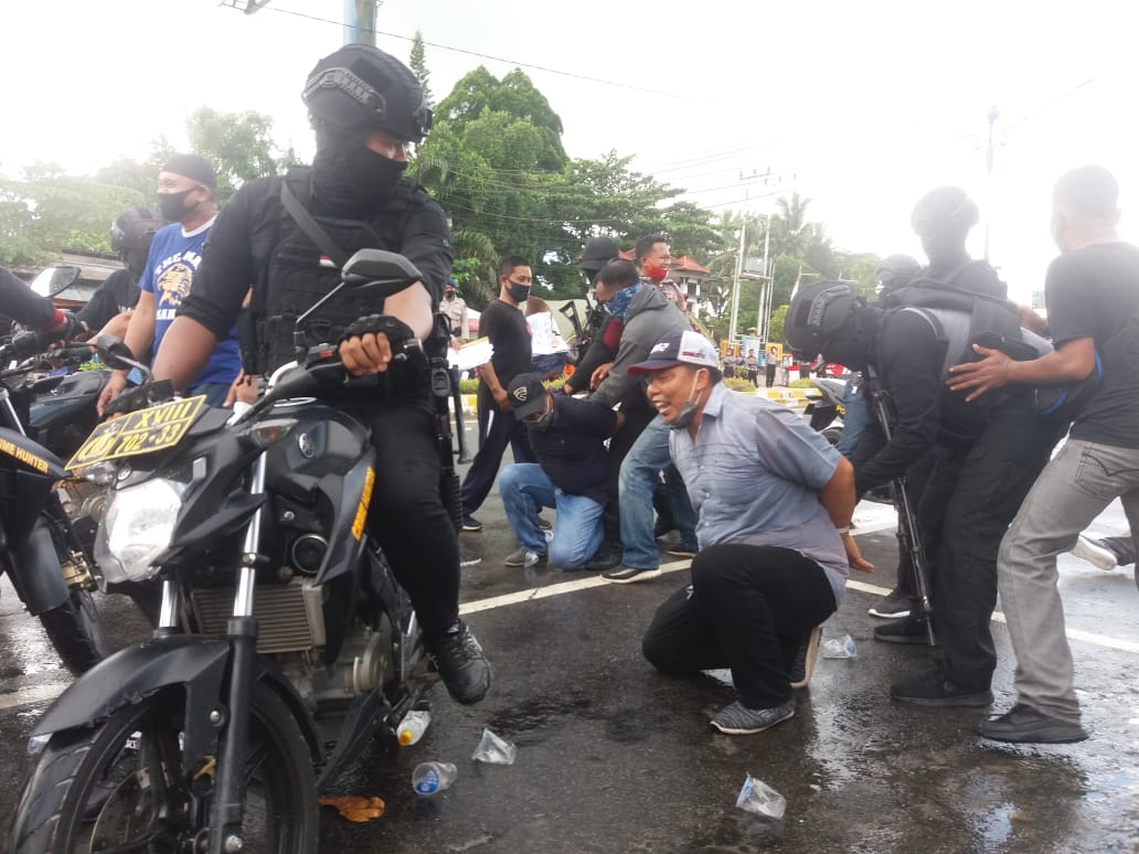 PANGKALAN BUN, KaltengEkspres.com – Jajaran Polisi Resort (Polres) Kobar menangkap beberapa orang massa yang anarkis dalam aksi unjuk rasa di depan Kantor KPUD Kobar. Penangkapan massa anarkis ini diperagakan saat digelarnya simulasi sispamkota Korwil IV di depan Kantor KPUD Kobar, Selasa (14/7/2020).